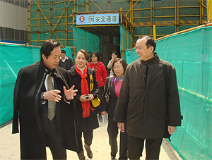 民進省委副秘書長、參政議政處處長云建等領導于2009年4月2日參觀三星電梯。圖為參觀生產現場和正在建設的研發中心大樓工地。